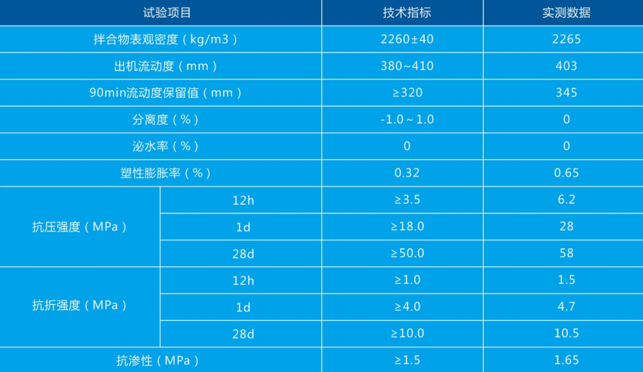 1、流动性大,初始截锥流动度400mm;流动度保持性好,90分钟截锥流动度仍有320mm以上;