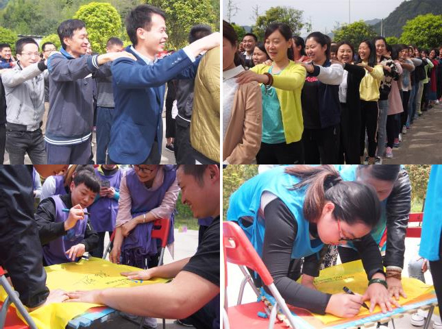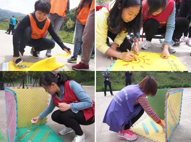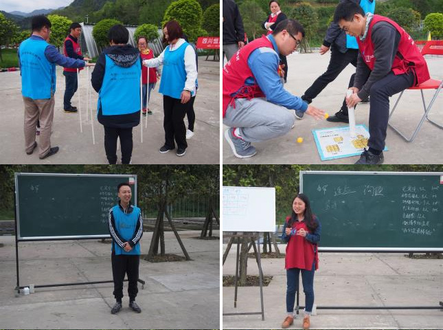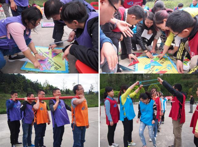 拓展训练在彭州宝山,参加人员被随机分为四队,通过集体讨论,确定了各自的队长、队名、队歌和口号。在训练过程中,四支队伍展开了激烈的竞争。